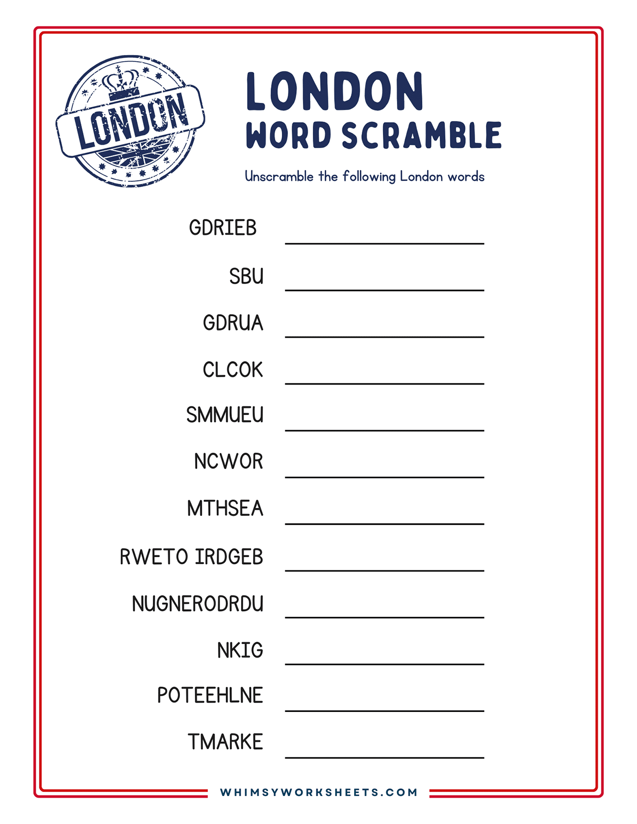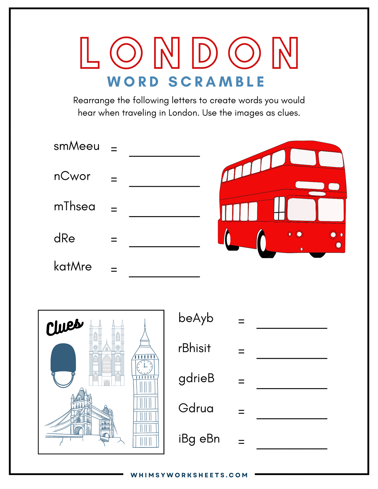 Dive into the excitement of London with 10 engaging word scrambles packed with iconic landmarks, fascinating history, famous transportation, thrilling sports, and rich culture. Unscramble the letters to uncover hidden words that showcase the charm of one of the world’s greatest cities. From Big Ben to tasty scones, each puzzle reveals something new and fun about London. It’s the perfect way to challenge your brain while exploring the city’s magic.